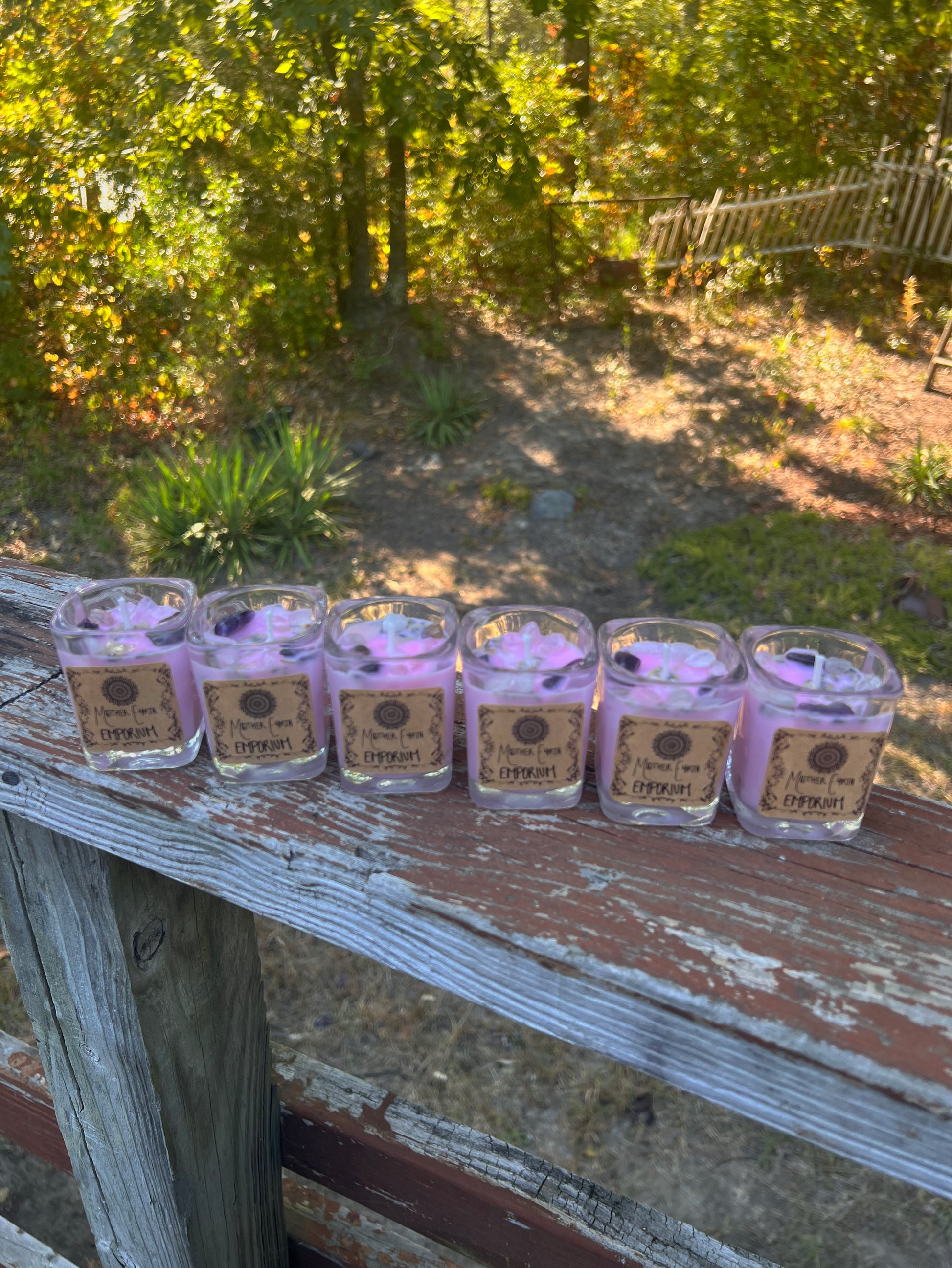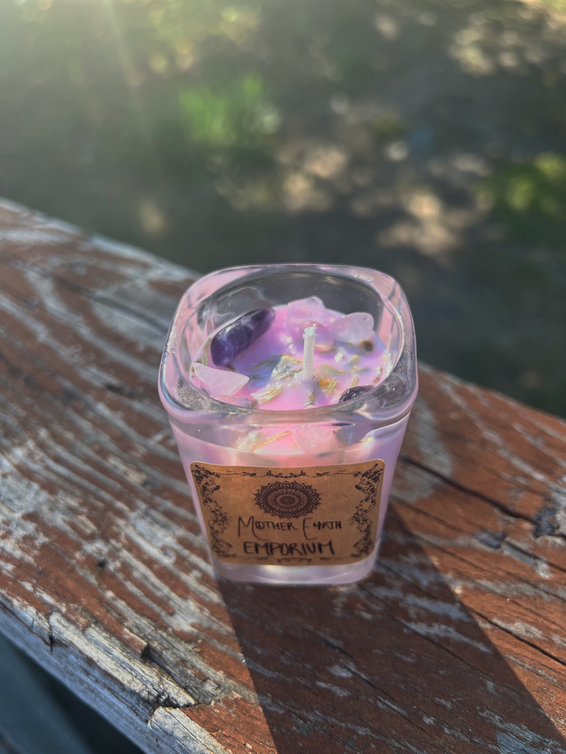 These mini candles are crafted with natural soy wax and topped with clear quartz for clarity and amethyst for peace. Sprinkled with dried lavender & chamomile, these herbs are used to promote relaxation.